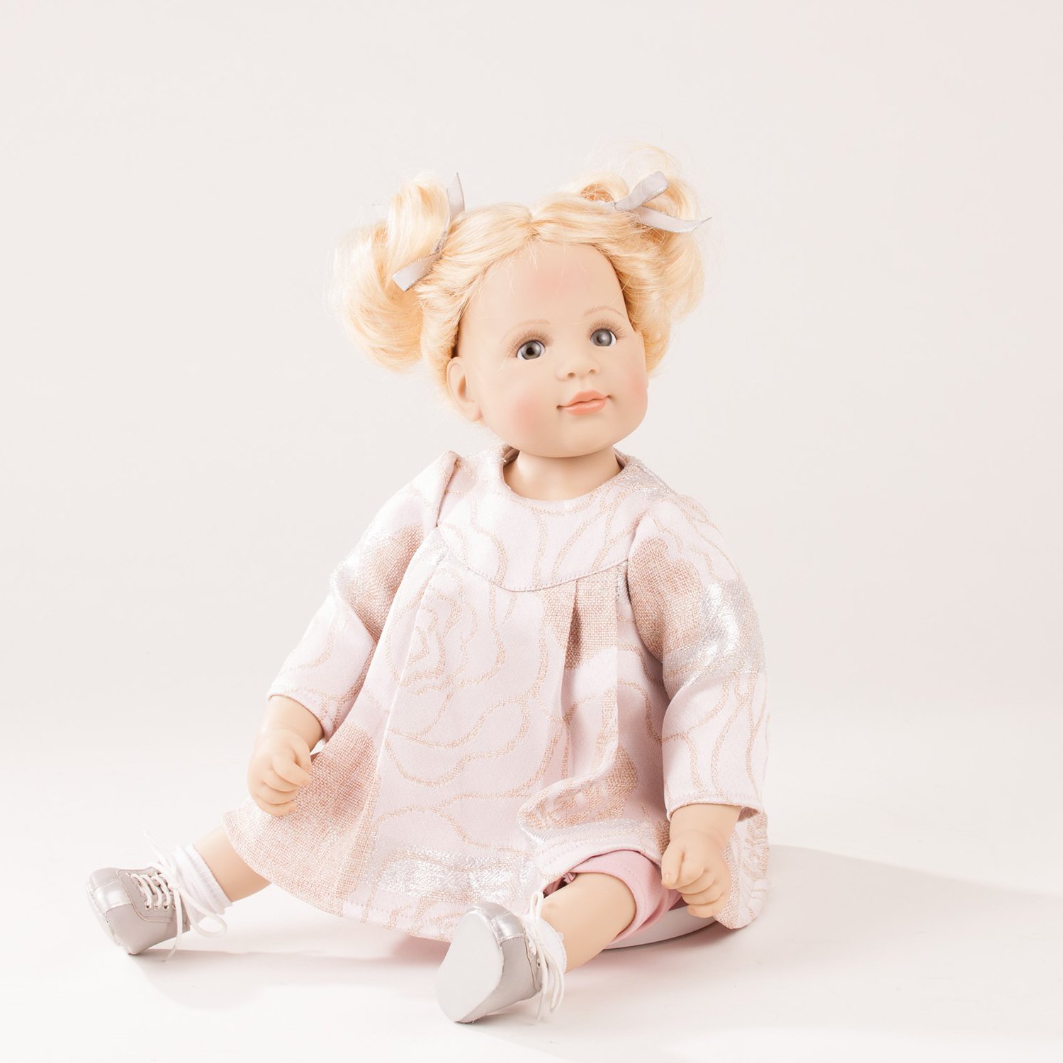 Uhh how pretty - Rosa´s jacquard dress woven with silver-rosé roses. Proud and self-confident her gray-green mouthblown eyes shine. Even her pigtales are decorated with silvery glitter ribbons. Nobody can resist admiring her!
