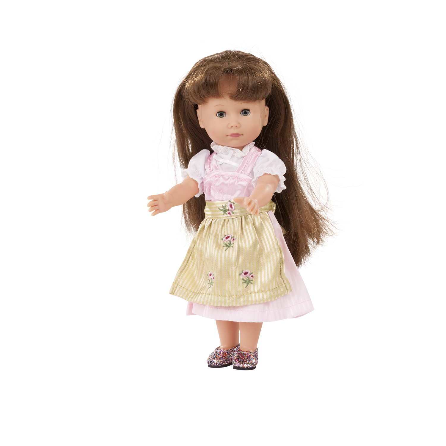Es ist Festzeit und deine Puppe wird mit diesem Set glänzen. Das besonders schicke Dirndl aus feinem Stoff mit schillerndem Streifenmuster, Blumenstickerei auf der Schürze und der stilechten Dirndlbluse wird noch einmal aufgewertet durch die goldigen Glitzerballerinas.