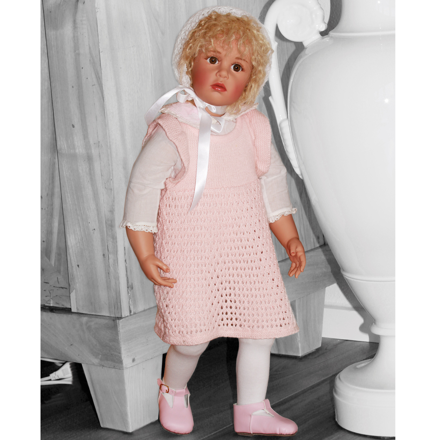 Susie ist ein wenig schüchtern. Ihr tiefgründiger Blick durch mundgeblasene Glasaugen, ihre zarten Gesichtzüge und ihr strahlend blondes Echthaar machen Susie zu einer besonderen Schönheit, die man am liebsten gleich in den Arm nehmen würde. Susies zartes Wesen wird durch ihr pastelliges Strickkleidchen unterstrichen.