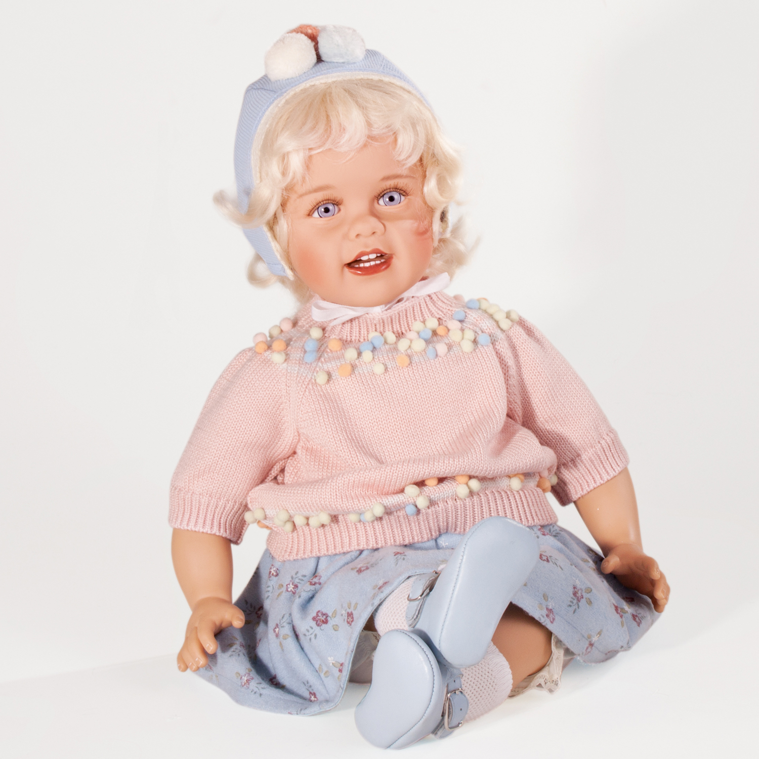 Just like an angel. Selma simply looks lovely with her blonde mohair curls and her mouth-blown ice-blue glass eyes. Sometimes she hides her curly hair under the cute knitted hat which she loves to pull into her sweet face. She feels wonderful in the outfit combination of pink knit pullover, blue skirt and genuine leather shoes – and enjoys being admired.